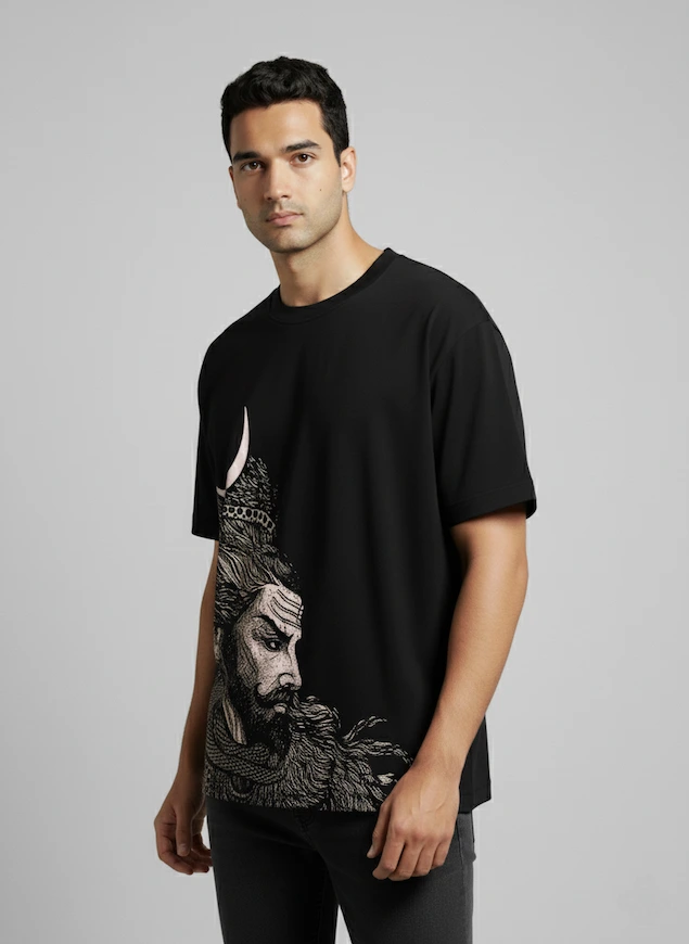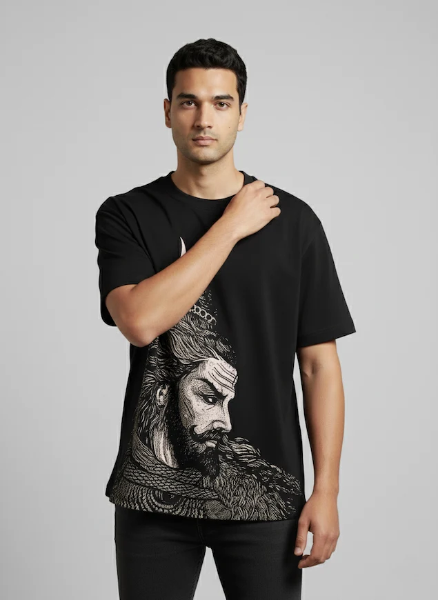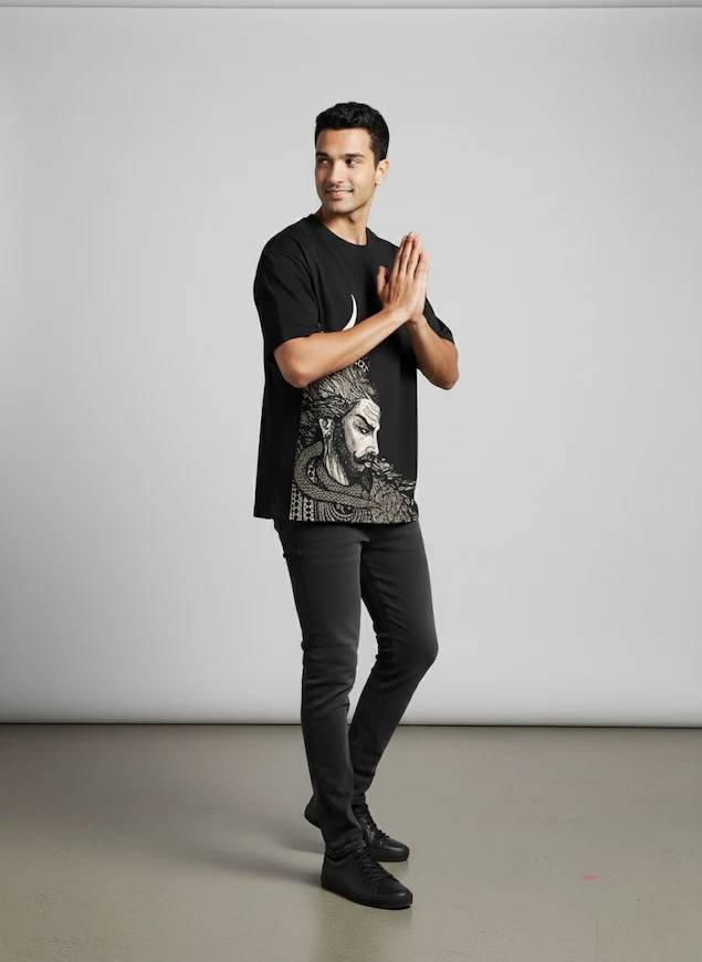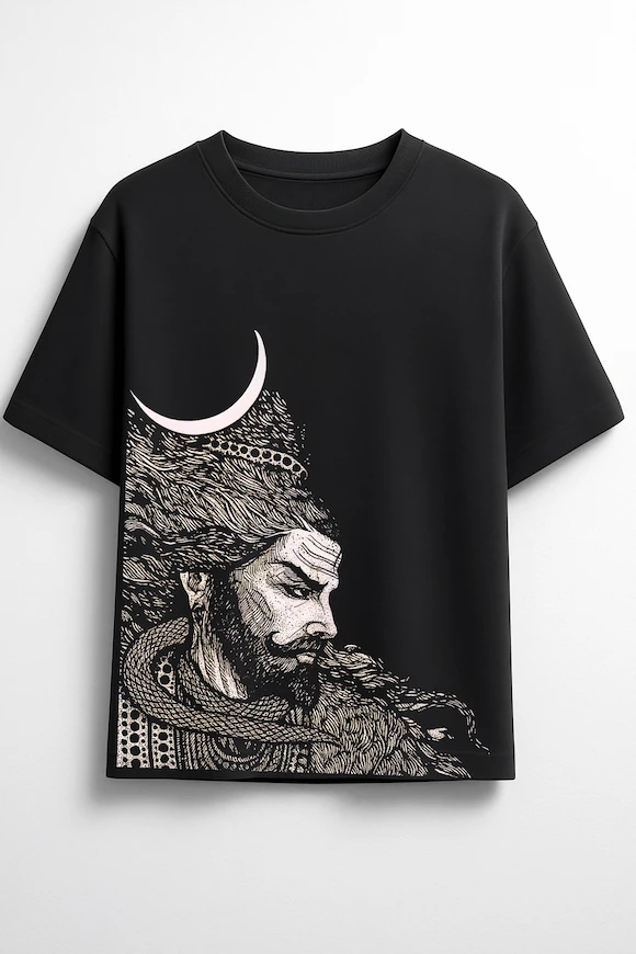 Crafted from 100% premium cotton (240 GSM), this oversized tee features a stunning front graphic of Lord Shivji in a meditative yet intense form. With detailed linework showcasing his flowing Jata (hair), coiled serpent, crescent moon, and a serene yet commanding expression, the design captures the raw power and calm of Mahadev. This tee merges ancient spirituality with modern street culture—made for those who walk fearlessly with divine energy.